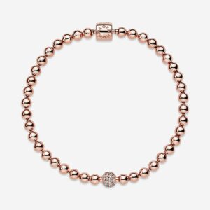 When you want to wear chunky and edgy beads with an elegant twist, this 14k rose gold-plated Beads & Pavé Bracelet is a perfect choice. The bracelet takes its inspiration from the alternative looks of body piercings and punk-inspired styles and adds a polished, refined twist. It features a fully beaded chain with one large pavé-set bead and a barrel clasp. The bracelet is designed to be worn alone or stacked with other bracelets in different metal finishes for the ultimate look.