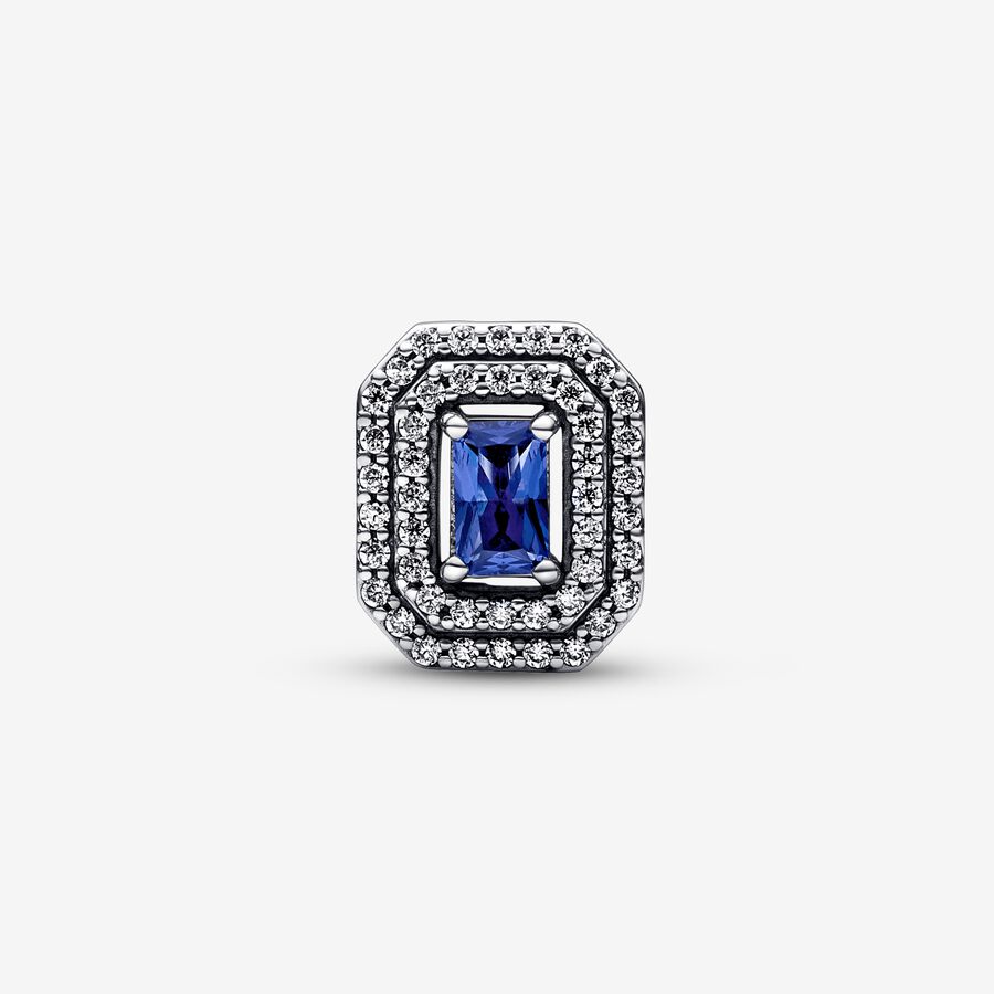 Bring a sophisticated touch of color to your jewelry with the Blue Sparkling Leveled Rectangular Charm. Crafted from sterling silver, each side of the charm features a princess blue, rectangular, radiant-cut, man-made crystal at the center, outlined by two rows of clear cubic zirconia pavé. A cut-out heart pattern features on the sides. Style this piece on your go-to Pandora Moments bracelet to make a sparkling statement.