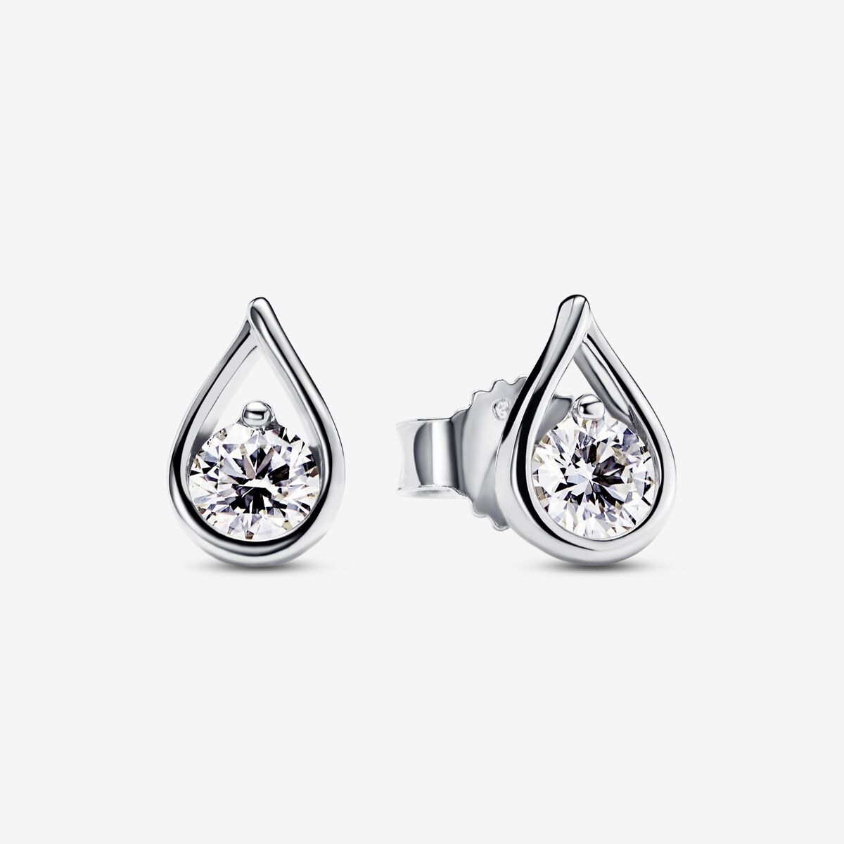 “A pair of solid sterling silver stud earrings each hand set with a 0.25 carat lab-created diamond. A sparkling celebration of the infinite potential within all of us, these earrings feature a radiant round brilliant lab-created diamond suspended in our modern infinity setting. “