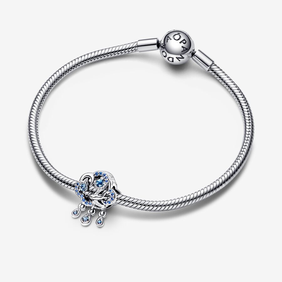 Immerse yourself in spring with our Cloud & Swallow Charm. This sterling silver charm features an intricate swirling cloud scene detailed with soaring swallows and sparkling pavé in varying shades of blue. Three raindrops set with blue man-made crystals dangle from the cloud. Engraved with “Let your dreams be your wings”, wear it as an everyday reminder of all the inspiring possibilities that lie ahead.