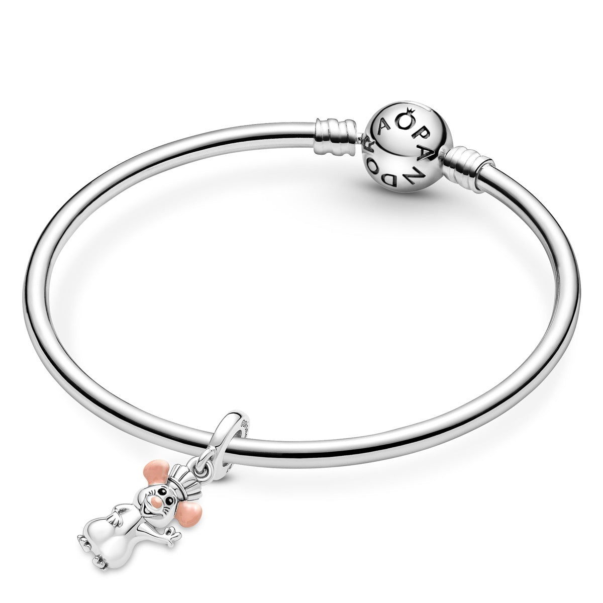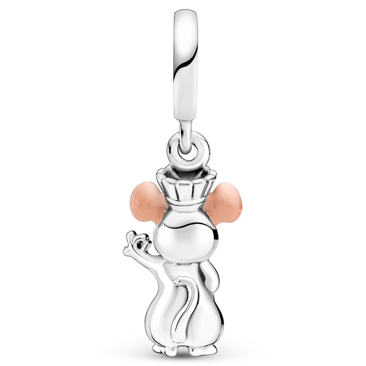 Follow your dreams with Pixar’s Remy. This sterling silver dangle charm features Remy from Disney and Pixar’s Ratatouille wearing his chef’s hat and making a chef’s kiss gesture. Hand-applied pink enamel colors his ears and nose and black enamel brings his eyes to life. Style this charm on your Pandora jewelry as a reminder to follow your heart and never give up.