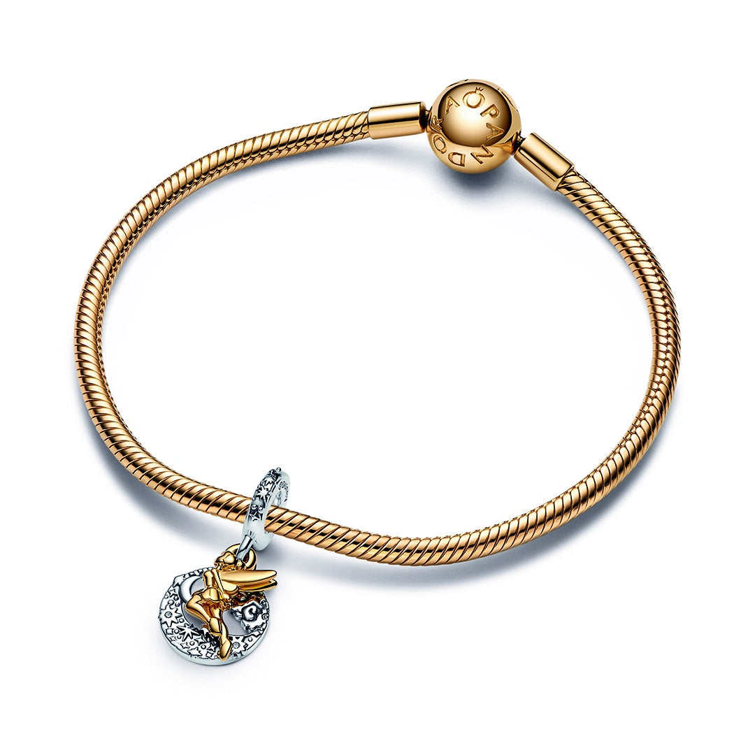 The next best thing to pixie dust, add our Disney Tinker Bell Celestial Night Dangle Charm to your collection for a touch of everyday magic. This two-tone charm is hand-finished in sterling silver and 14k gold plating and features Tinker Bell in her classic flying pose. Two brilliant-cut clear cubic zirconia mimic the light in the evening sky as she soars off to new adventures.