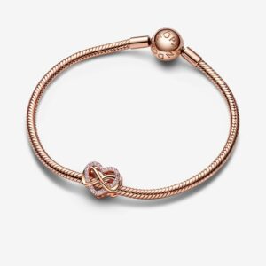 Say “love you forever” with 14k rose gold plating and sparkling stones. Our openwork charm features an infinity symbol wrapping an open heart to symbolize everlasting love that binds families together. A constellation of brilliant-cut, pink cubic zirconia decorates the heart outline and adds a pop of color. Style this charm on your bracelet and carry reminders of your loved ones wherever you go.