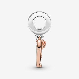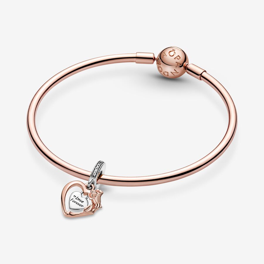 Deliver a message of love with the Heart & Rose Flower Dangle Charm. Hand-finished in sterling silver and 14k rose gold-plating, this design includes a heart-shaped frame with a padlock heart dangling within it. The frame features intricate rose petal and leaf details, while the padlock includes the engraving “Love forever” and sparkling stones decorate the bail. Inspired by William Shakespeare’s play Romeo & Juliet, gift this piece to the one that has your heart.