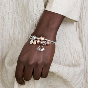 Set your heart a-flutter with this romantic version of Pandora’s bestselling charm bracelet. Hand-finished with a 14k rose gold-plated heart-shaped clasp, this sterling silver Moments Heart & Snake Chain Bracelet looks stunning on its own but even better adorned with your favourite Pandora Moments charms and clips. Layer it with contrasting Pandora chain bracelets for a chic, multi-layered look.