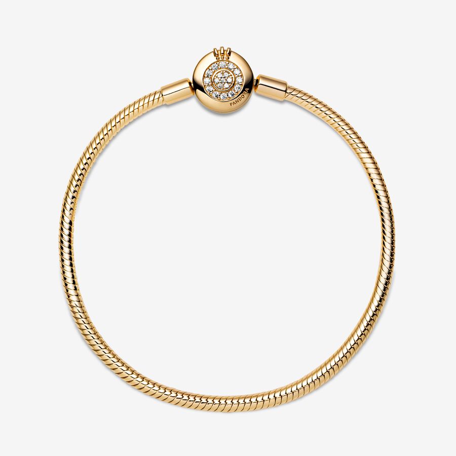 Bring some sparkle to every moment with the Pandora Moments Sparkling Crown O Snake Chain Bracelet. Hand-finished in 14k gold plating the bracelet’s clasp features the iconic Pandora crown O monogram and sparkling clear cubic zirconia pavé, while the snake chain brings a chic and modern touch to your wrist. Stack it with other bracelets and load it up with favourite charms for a piece you’ll reach for over and over.