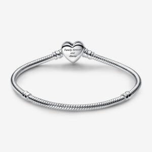 Representing the eternal love that binds family together, the Pandora Moments Sparkling Infinity Heart Clasp Snake Chain Bracelet is a meaningful gift for the ones that matter most to you. The openwork heart clasp features stones along the edge and an asymmetrical infinity symbol entwining around the heart. The back of the clasp is engraved with the message “Family forever and Always”. The bracelet features two threaders (raised charm dividers) dividing it into three sections. Style it with up to 16-18 of your favorite charms or dangle charms to symbolize the ones you love, or gift it to someone close to your heart.