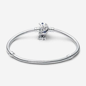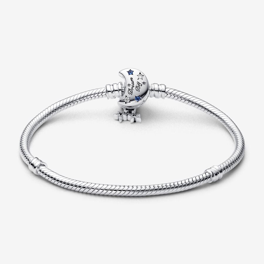 Bring a celestial touch to your style with the Moments Sparkling Moon Clasp Snake Chain Bracelet. With a clasp shaped like a crescent moon, this sterling silver snake chain bracelet has a “Dream big” engraving on the clasp’s back. The intricate clasp features cut-out stars and circles set with six blue man-made crystals and five clear cubic zirconia, as well as microbeading and imprinted detailing. Two asymmetrical stars set with sparkling stones dangle from the clasp, adding a dash of movement to this essential piece.Compatible WithMomentsColourBlueProduct TypeBraceletsItem592819C01MetalSterling silverMaterialNo Other MaterialDimensionsDepth:8.6 mmHeight:17.8 mmWidth:9 mm