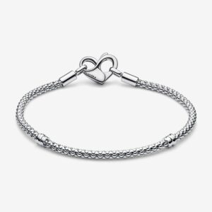 Update your collection with our new Pandora Moments Studded Chain Bracelet. Hand-finished in sterling silver, this bracelet features a flexible, textured chain and an infinity-detailed openable heart-shaped clasp with an interior infinity symbol. Please note: a maximum of 14-18 charms, dangle charms or pendants can be styled among the three sections divided by the threaders.