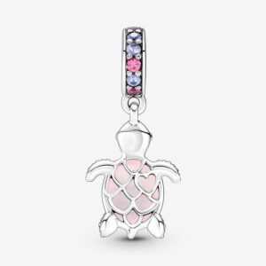 Our much-loved sea turtle charm is joined by a new friend in frosted pink. This sterling silver dangle charm features pink and purple man-made crystals on the bail and frosted Murano glass as its shell with unique shimmering flecks that catch the light. The belly of the sea turtle has a sterling silver cut-out pattern with an off-center heart to create a pretty scale-like effect. Carry more turtle friends on your Pandora Moments bracelet or charm holders.