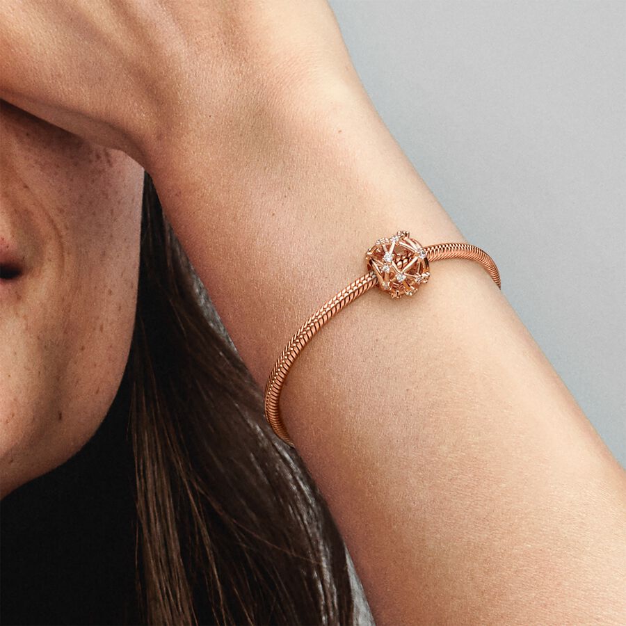 Look to the night sky for answers with the Openwork Star Constellations Charm. Hand-finished in 14k rose gold plating, this piece is inspired by a galaxy-themed design from Pandora’s archive. Clear stones are set along the charm’s rounded openwork lines to mimic the formation of the stars in space. Wear this piece alongside other zodiac-inspired charms on your Pandora Moments bracelet to show that you love the universe.