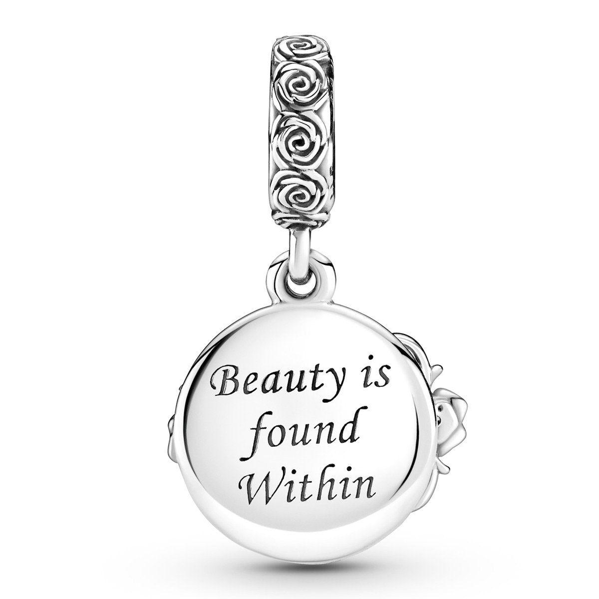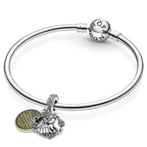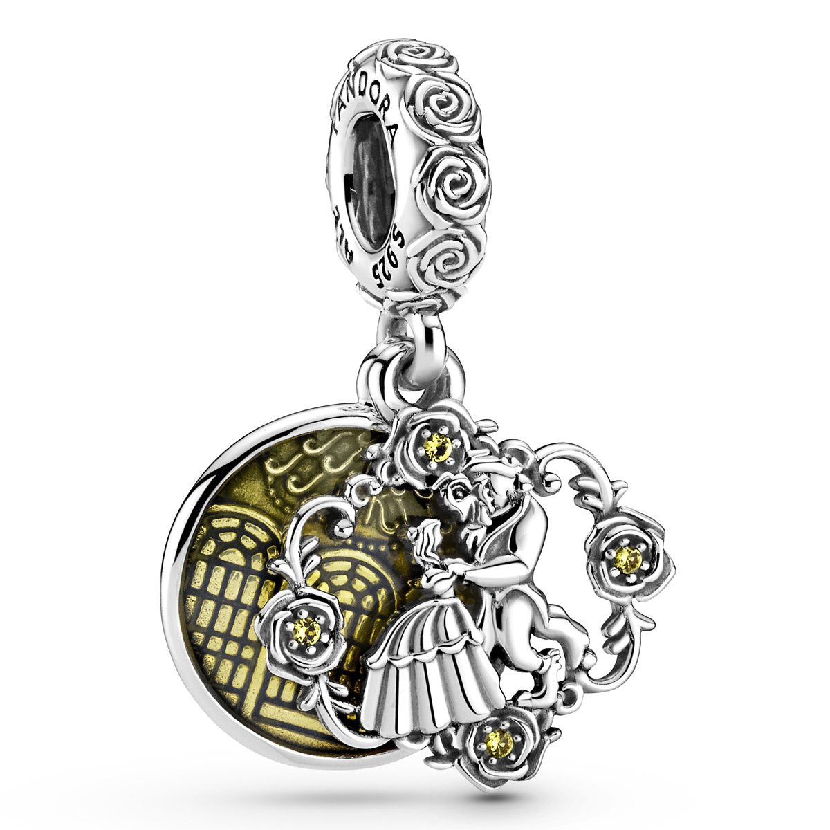 Enter the magical world of Disney’s Beauty and the Beast with this evocative double dangle charm. Disney’s Belle and the Beast dance within an openwork frame surrounded by roses set with man-made yellow crystals. The ballroom is depicted in a background disc in transparent yellow hand-applied basse-taille enamel technique. The bail features 3D rose details. Commemorating the imperfect but magical love between Belle and the Beast, the dangle charm is engraved with the phrase “Beauty is found Within”.