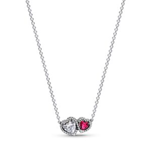 What the heart wants. The Halo Hearts Pendant Necklace features two connected hearts that symbolise profound love. Crafted in sterling silver, this piece showcases a heart-cut red man-made crystal and a heart-cut clear cubic zirconia, surrounded by sparkling pavé stones. With an adjustable cable chain (45 cm, 41.5 cm, and 38 cm), it’s perfect for layering or wearing solo to add a touch of romance to your look.
