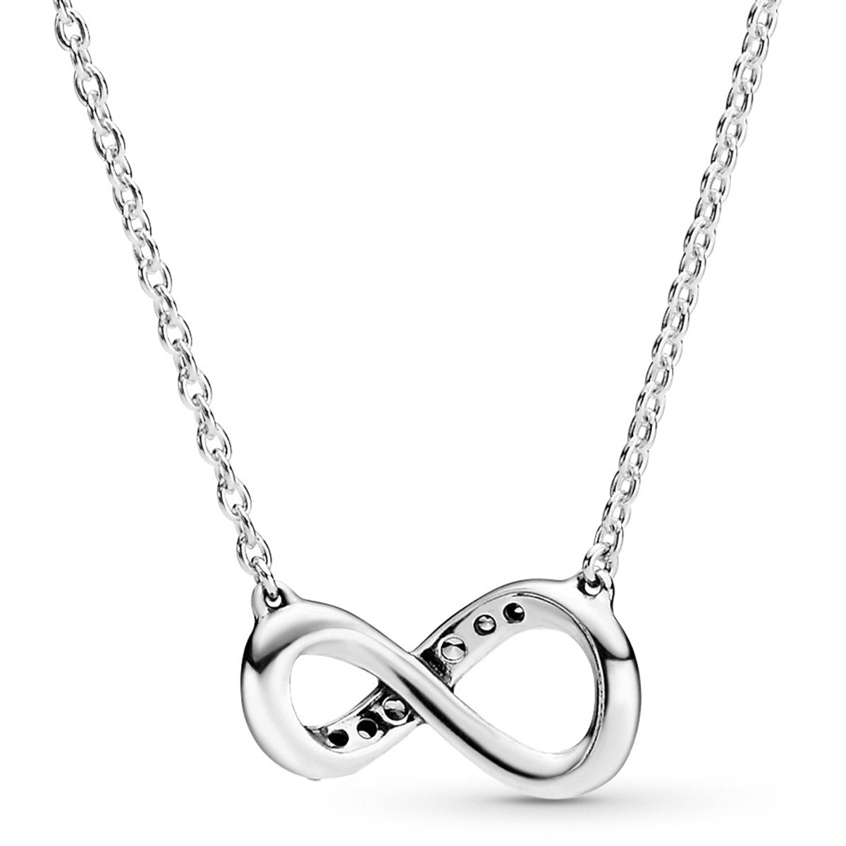 The delicate infinity collier necklace symbolizes love that lasts for all eternity. It dazzles in sterling silver and features clear cubic zirconia for added sparkle. Inspired by the eternal bond between a mother and a child, the infinity symbol lends gravitas to your emotions and helps you express exactly how you feel with a universally recognized sign for a deep connection. Style with other infinity-inspired pieces or gift the eternity necklace to someone you love to infinity and beyond.