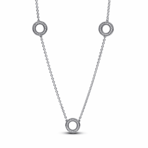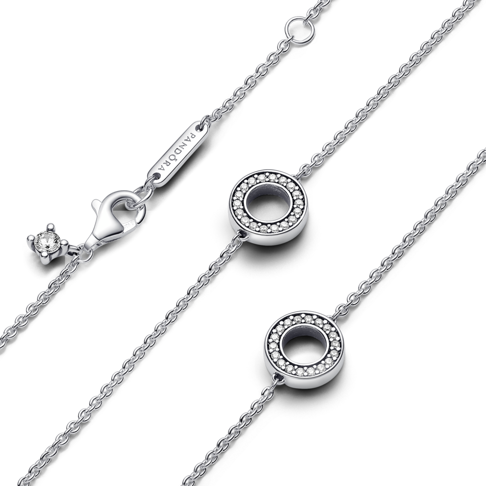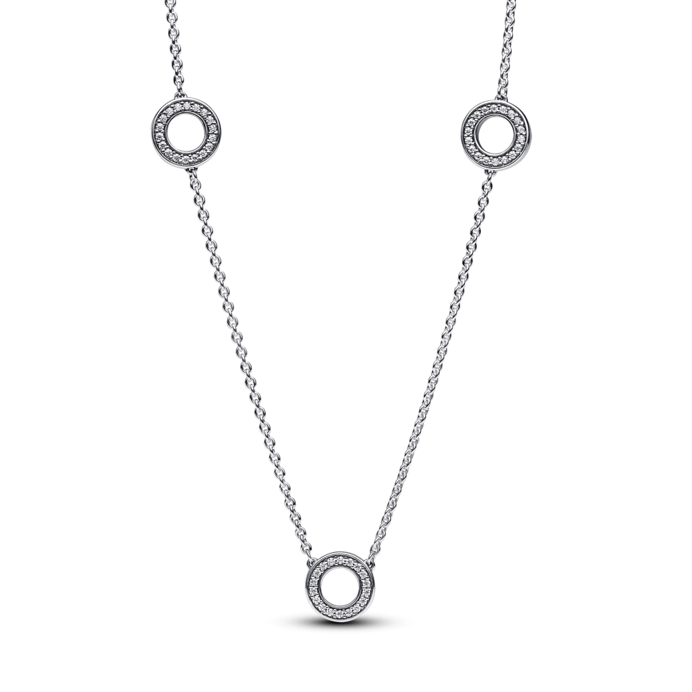 Elevate your style with the Pavé Circles Chain Necklace by Pandora. Crafted in sterling silver, this versatile piece features three pavé circles equally spaced along the cable chain. Each circle features polished sides and a row of clear cubic zirconia, accentuated by a raised polished line. The length of this necklace is adjustable, making it a perfect addition to any outfit. Inspired by the shine of pavé halos, this necklace is perfect for everyday wear and pairs effortlessly with other necklaces for a personalised look.