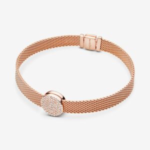 Add extra glow to your look with this Round Pavé Charm, featuring a classic combination of 14k rose gold plating and sparkling clear cubic zirconia. Made to be worn on our flat mesh and multi-strand bracelets, this Pandora Reflexions charm is plated with 14k rose gold. The flat, round design brings understated beauty to your look and is fitted with a hidden silicone grip to ensure it stays put on your bracelet. Wear it to mirror your personal style or gift it to someone you love.