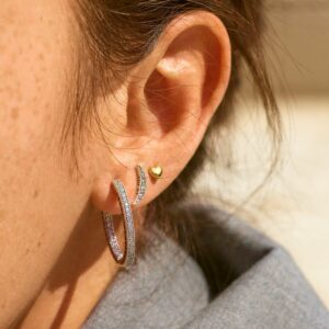 Classic, yet contemporary. Cute, yet cool. Curving around your ear to create an elegant look, this pair of hoop earrings is crafted from sterling silver. They’re studded with cubic zirconia and subtly detailed with our signature cut-out hearts along the sides. The understated pair work with everything; style them together or with other earrings in multiple piercings.