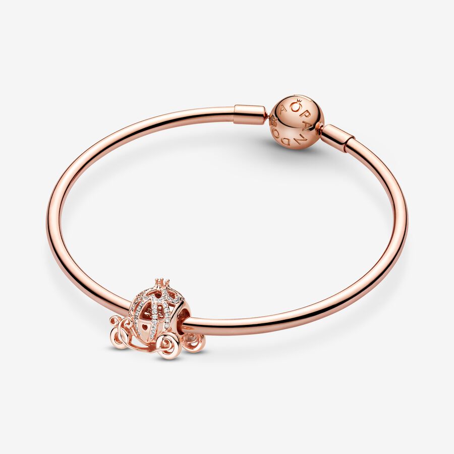 Show up to the ball in style with the Sparkling Carriage Charm. Designed to celebrate the 70th anniversary of ’s , this piece is hand-finished in 14k rose gold plating. Shaped like her pumpkin carriage, this openwork charm is decorated with clear stones and features a 3D crown on its roof and ornamental wheels. Style this charm on your Pandora Moments bracelet with shimmering pieces in sterling silver for a magical mixed metal look.