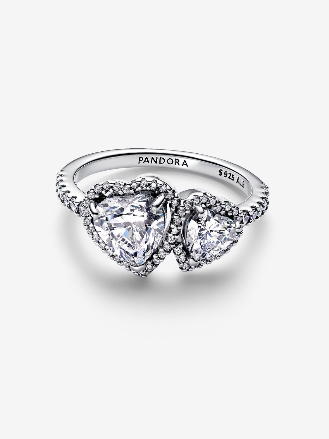 An eye-catching statement of love. This ring showcases two heart-cut clear cubic zirconia stones, connected by a halo of shimmering pavé. Crafted in sterling silver, the top half of the band is adorned with more sparkling stones, creating a radiant effect. Pair it with other sterling silver rings for a love-filled stack, or let it shine as a standalone statement. Inspired by the love that connects us, the two hearts symbolize harmony and unwavering support between two souls.
