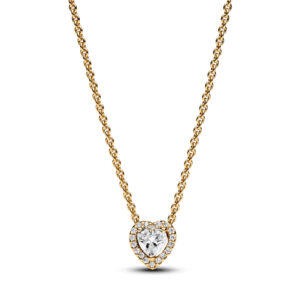 Make a statement with the Sparkling Heart Collier Necklace. This 14k gold-plated necklace is inspired by classic design elements from the Pandora Timeless collection. Featuring a raised heart-shaped central stone surrounded by a halo of clear cubic zirconia, the necklace also has a rectangular tag near the clasp with an engraved Pandora logo. Adjust the necklace length to suit your style and wear with other heart-shaped pieces for a look filled with love.