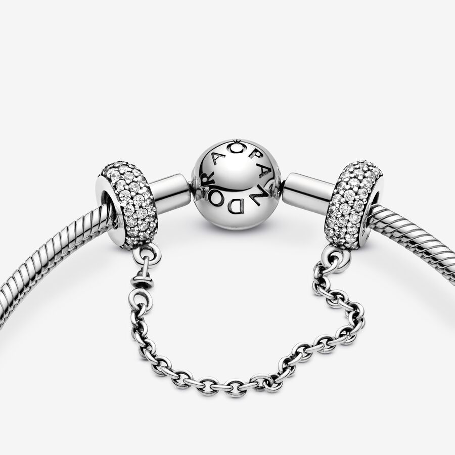 You’ve collected the charms that celebrate your memories and mark your milestones, now keep them safe on your Pandora Moments bracelet with this sterling silver safety chain charm. Accented with cubic zirconia for a sparkling finish, it’s decorative in its own right, and fitted with a swivel chain for tangle-free styling.