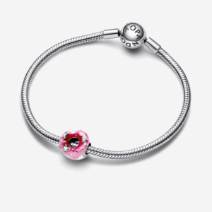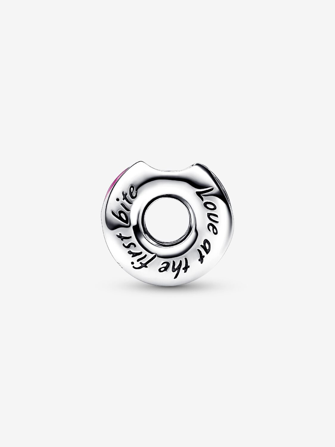 A jewelry gift as sweet as your love. The Sparkling Sprinkled Donut Charm is inspired by a universe of pop art and saturated candy colours. This playful yet modern charm takes the shape of a donut in sterling silver, complete with hand-applied pink gradient enamel frosting and a bite taken out of one side (who can resist a delicious donut?). The frosting is topped with polished silver sprinkles, one clear cubic zirconia and two Aurora Borealis cubic zirconia – shimmering with clear, pink and blue tones depending on how the light hits. The back is engraved with the words “Love at the first bite.” An irresistible treat to add to your favourite Pandora jewellery.