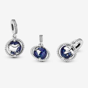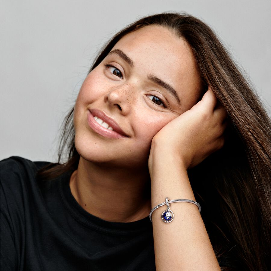 Let your love of travel shape your style with this globe charm. The hand-finished piece is shaped as the Earth and spins on its beaded axis. The globe charm features hand-applied shimmering blue enamel for a water-like finish. Thread it on your favourite Pandora Moments bracelet together with other travel-inspired charms that channel your wanderlust for a globetrotter look.