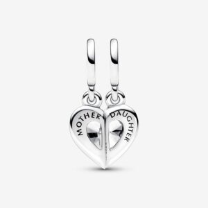 A meaningful charm to symbolize the unbreakable bond between mother and daughter. The Splittable Mother & Daughter Dangle Charm consists of two sterling silver dangle charms that fit together to create a heart shape in two halves, with a clear cubic zirconia stone at the center and a cut-out heart on the reverse side. One half of the charm is engraved with the word “MOTHER” and the other half with “DAUGHTER”, so you can each wear one half as a reminder that the love you share is always there, even when you’re apart – because you’ll always have a piece of each other’s heart.