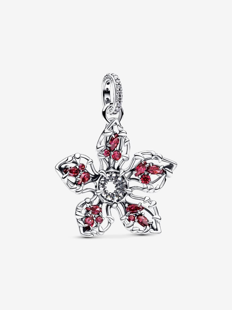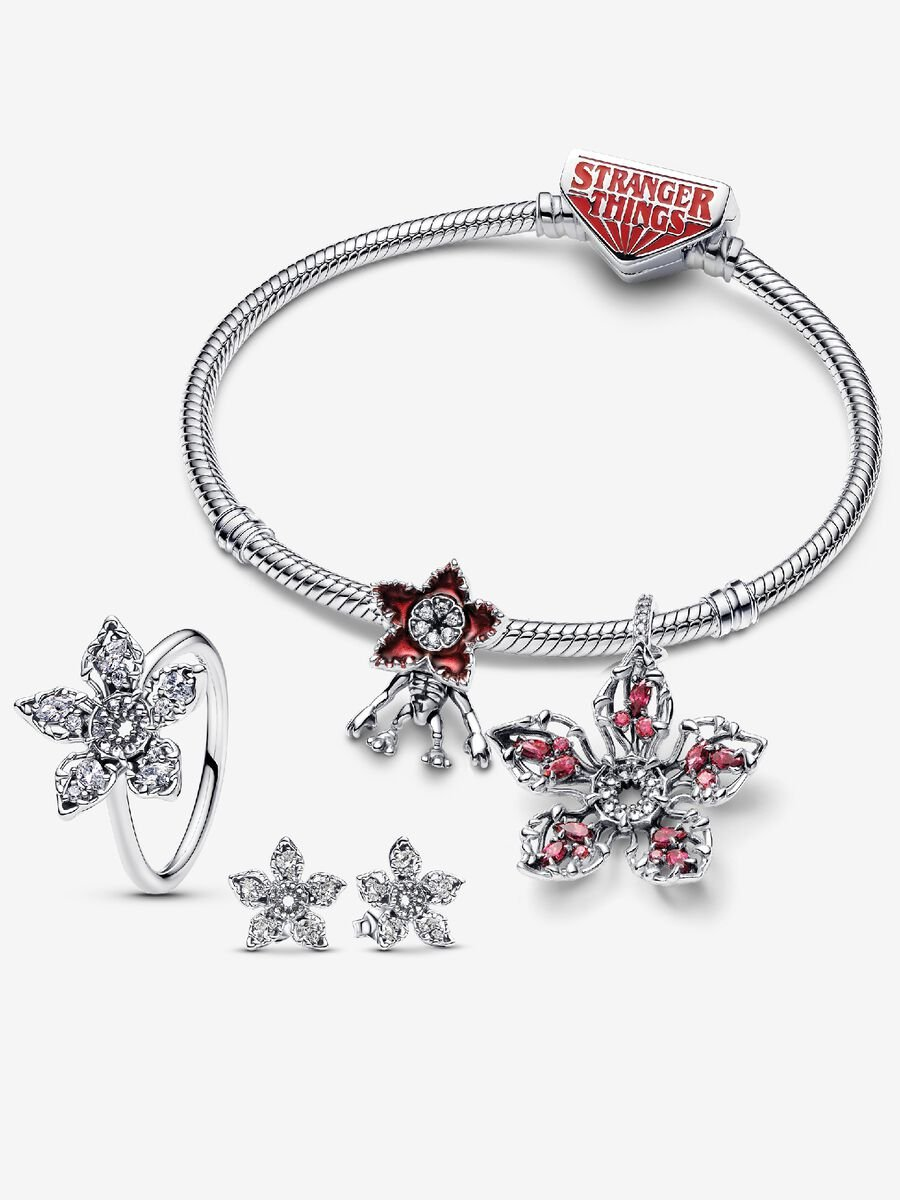 Frighteningly beautiful, sparkling and fierce. The fan-favorite monster from the Upside Down comes to life through exquisite craftsmanship and intricate detailing. This 5-piece set includes a ring, pendant, charm, and stud earrings all featuring the iconic flower-shaped mouth of the Demogorgon—salivating with glistening stones and fang-shaped prongs that depict the creature’s monstrous beauty. Paired with the Stranger Things clasp bracelet, wear this set as a badge of honor to show that you don’t just face your Demogorgons—you own them.