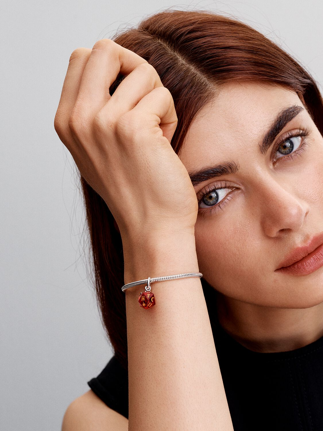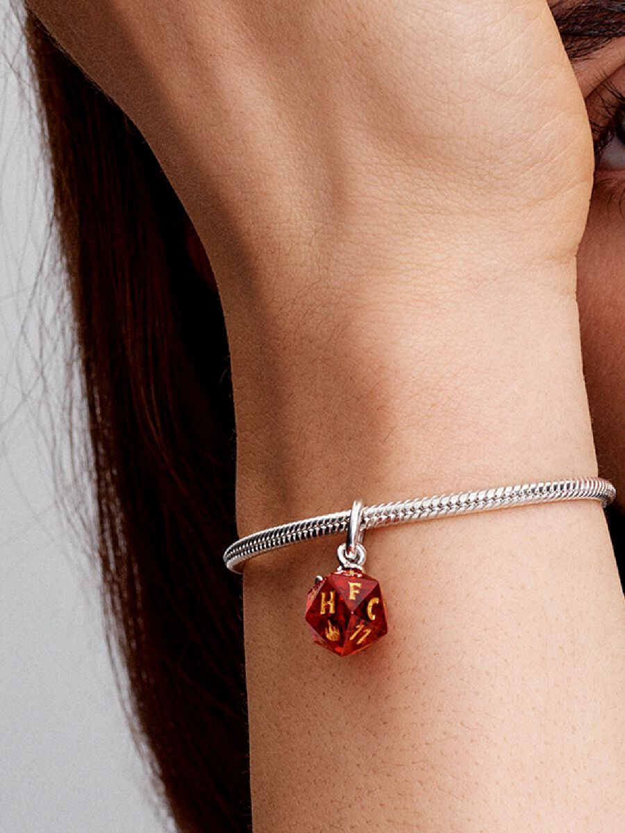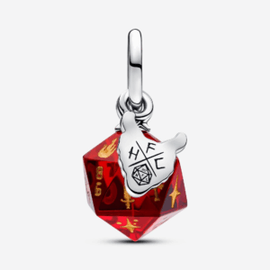 Roll with the nerds and monsters of Hawkins with our Stranger Things Hellfire Club Dice Dangle Charm. Our 20-sided Hellfire Club dice is crafted from Murano glass with enamel motifs inspired by the club and their game. A sterling silver Hellfire Club logo dangles next to it, complete with the iconic skull and horns.