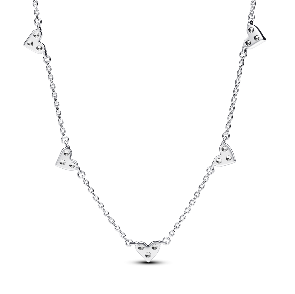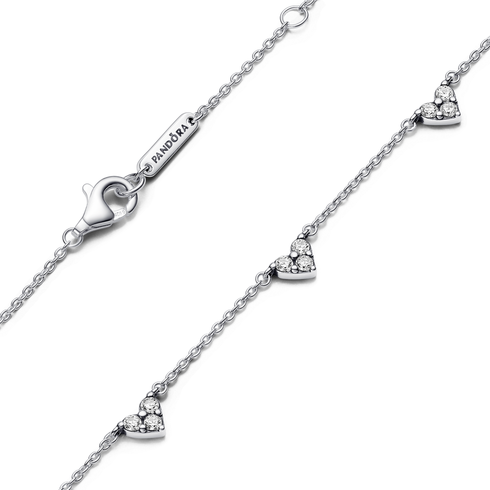 Embody elegance with the Triple Stone Heart Station Chain Necklace from our Pandora Timeless collection. Crafted from sterling silver, it features five mini three-stone heart motifs affixed to the chain, creating a timeless look with a twist of emotion. The adjustable 45 cm chain, with a subtle Pandora logo, ensures a perfect fit. With a heartfelt motif and a delicate nod to the beauty of sparkle, this necklace is an ideal gift for special occasions or a stylish addition to your own collection.