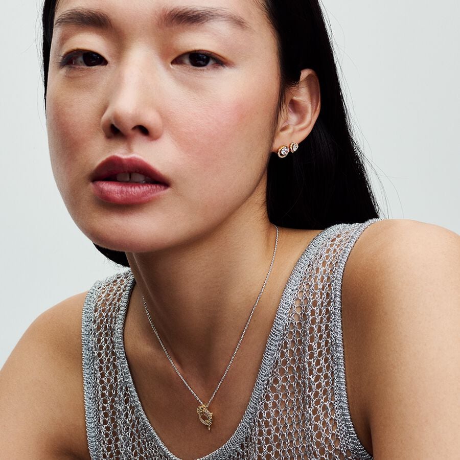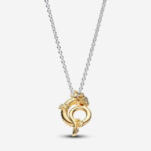 Invite good fortune in the coming year with the Two-tone Chinese Year of the Dragon Collier Necklace. 2024 is the Year of the Dragon – the 5th animal in the Chinese zodiac, this mythical creature represents good fortune, strength, power, wisdom and health. This sterling silver necklace features a curled dragon pendant in 14k gold plating with intricate details and a row of sparkling pavé along the dragon’s body. The pendant is not detachable and slides freely along the sterling silver chain, which is adjustable in length. A 14k gold-plated peace knot dangles near the clasp. Wear this necklace to invite the qualities of the dragon into your year ahead, or gift it to a loved one who was born in the Year of the Dragon.