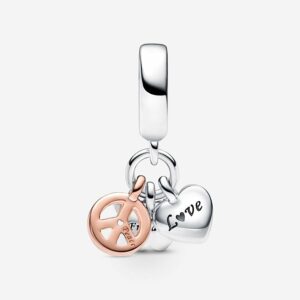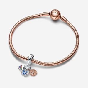 Bring extra meaning to your styling with our Two-tone Rainbow Heart, Butterfly & Peace Triple Dangle Charm. This triple dangle charm features a sterling silver heart set with two rows of rainbow pavé and engraved with “Love” on the back a sterling silver butterfly shaded with hand-applied blue enamel and engraved with “Freedom” on the back and a 14k rose gold-plated peace sign detailed with microbeads and a stone at its centre and engraved with “Peace” on the back. Wear it as an everyday reminder of your values.