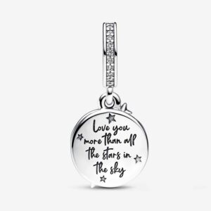 Wish upon a star with the Two-tone Shooting Star Double Dangle Charm. Crafted with both sterling silver and 14k rose gold-plated metal, this one’s sure to be a hit among lovers of two-tone charms. With a “Love you more than all the stars in the sky” engraving, this shooting star charm features shimmering blue enamel to represent a galaxy filled with twinkling stars. The dangle charm’s second disc has an openwork pattern of shooting stars, where each star has a curved trail of sparkling stones and beaded details. A row of stones on the bail adds a sparkling touch. Add some special shine to your everyday, or inspire someone you love to always shoot for the stars.